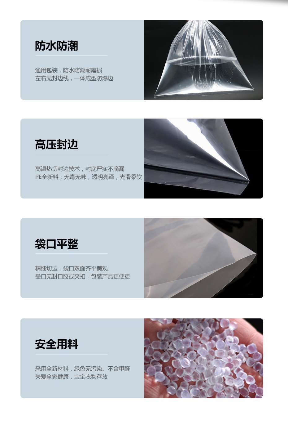 透明食品袋通過簡單的制作工藝,由機器吹膜后,再到制袋機上面切成一個一個袋子,底部封口。