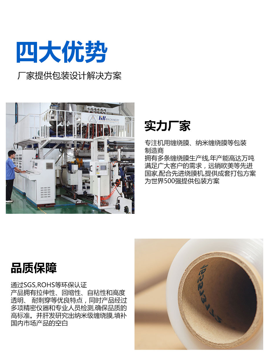 黃色纏繞膜采用進口線性聚乙烯LLDPE樹脂及增粘劑特種助劑比例配方生產,能生產手用、阻力型機用、預拉伸型機用、防紫外線、抗靜電和防銹等多功能纏繞膜。具有以下優點: